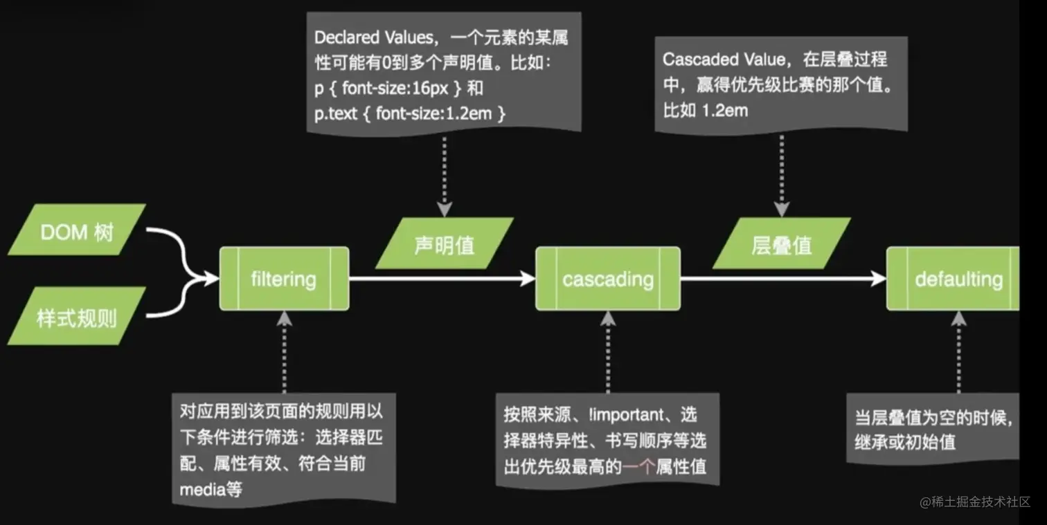 - 选择器匹配阶段:浏览器根据选择器匹配元素,并找到适用的样式规则。