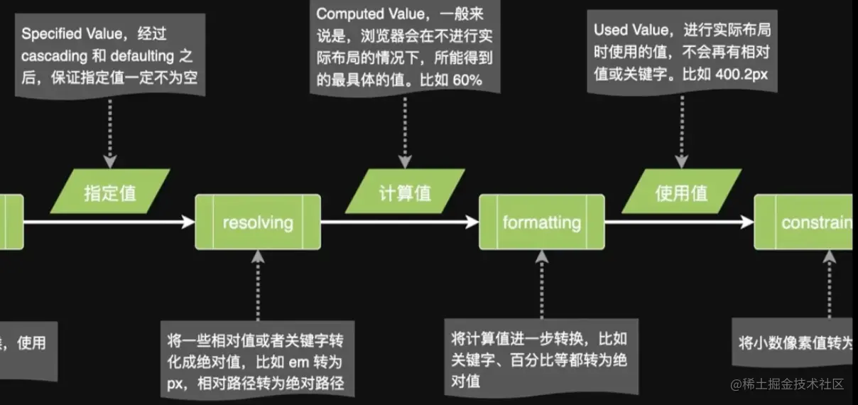 - 最终渲染:浏览器使用格式化值来渲染页面。