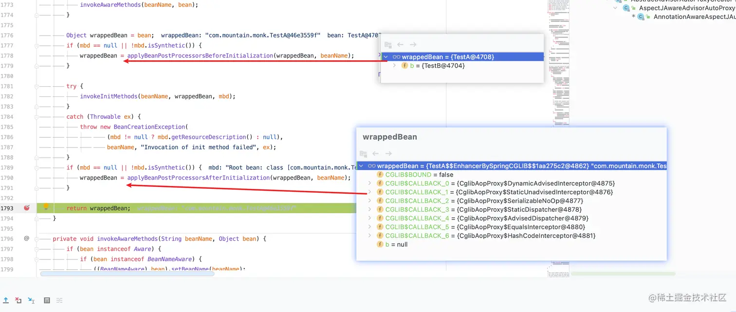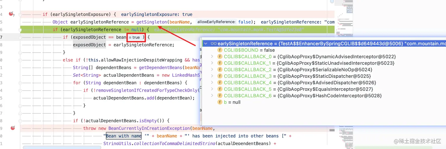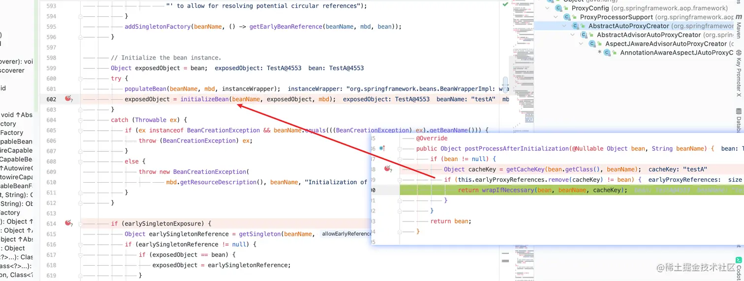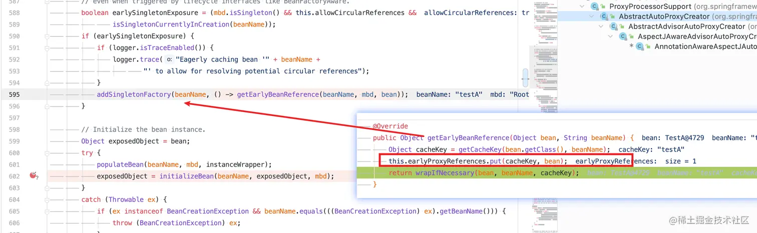 如果遇到依赖循环,那么就会在实例化的时候就创建代理了,这里还有一个重要的就是,他会把依赖循环中创建代理的bean给缓存起来,图中已经标注了,后续执行到applyBeanPostProcessorsAfterInitialization的时候也不会再创建一遍代理,而是跳过