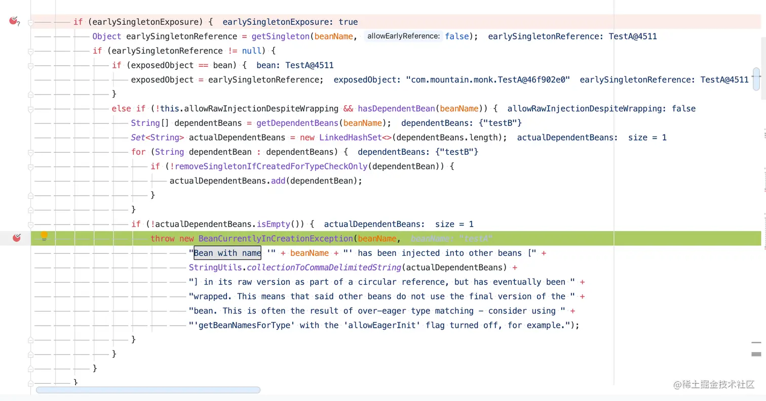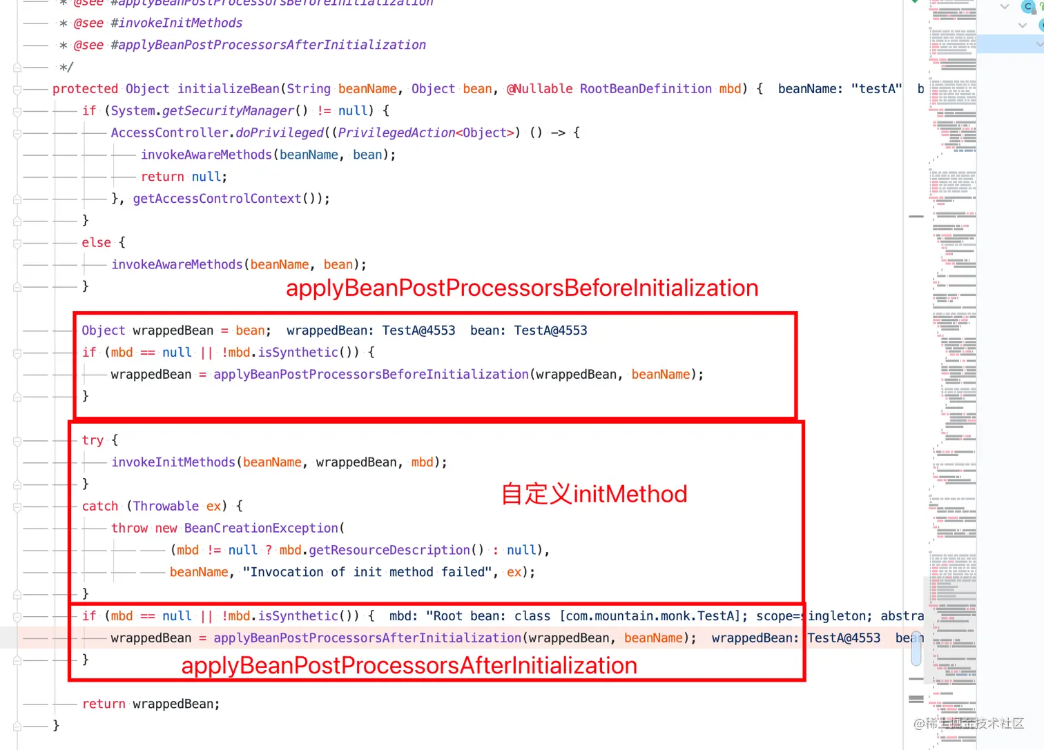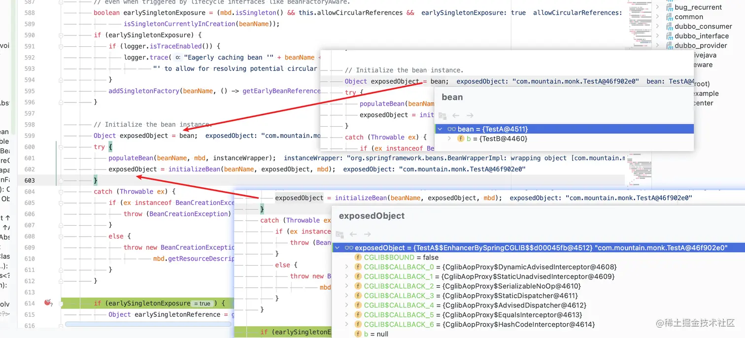 如果遇到依赖循环,那么就会在实例化的时候就创建代理了,这里还有一个重要的就是,他会把依赖循环中创建代理的bean给缓存起来,图中已经标注了,后续执行到applyBeanPostProcessorsAfterInitialization的时候也不会再创建一遍代理,而是跳过