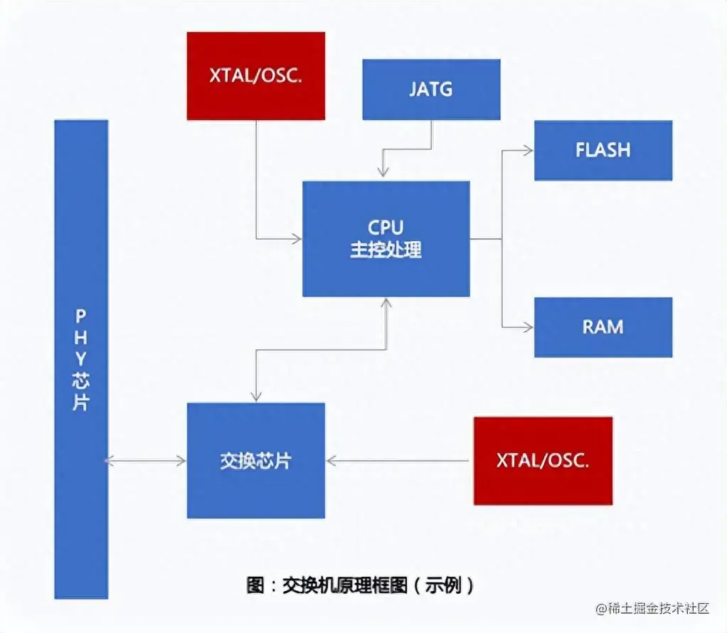 交换机硬件部分主要由以太网交换模块、CPU控制模块、PHY芯片、接口模块、电源模块等组成 。交换模块是影响数据存储转发交换的决定性因素,高性能交换的功能主要由交换芯片完成。