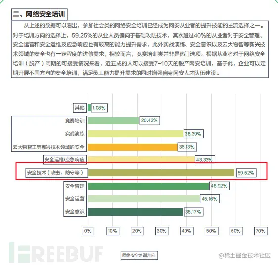 网络安全培训选择: 网安爱好者自主选择提升能力方式主要以自学和参加网络安全培训班为主, 参加社会类的网络安全培训已经成为网安从业者提升技能的主流选择之一 。而在培训方向选择上,59.25%的从业人员偏向于基础攻防技术,也就是网络安全行业里热门的渗透工程师岗位。