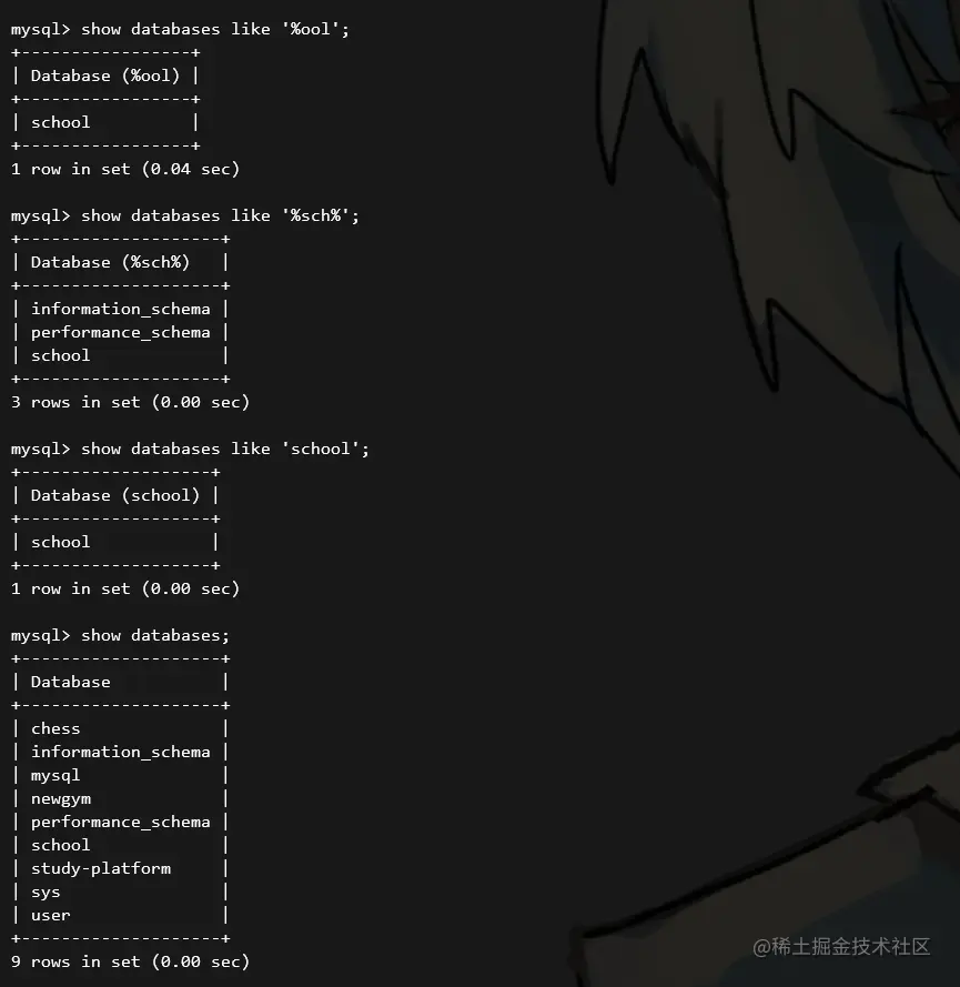 2.查看名字中包含sch的数据库(%表示任意个字符)