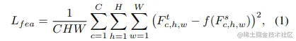 在这种蒸馏方法中,作者让学生模仿教师模型的主干网络中的某一层。为了实现这一目标,文中使用均方误差(MSE)损失来计算学生特征与教师特征之间的距离。损失函数的表达式如下: