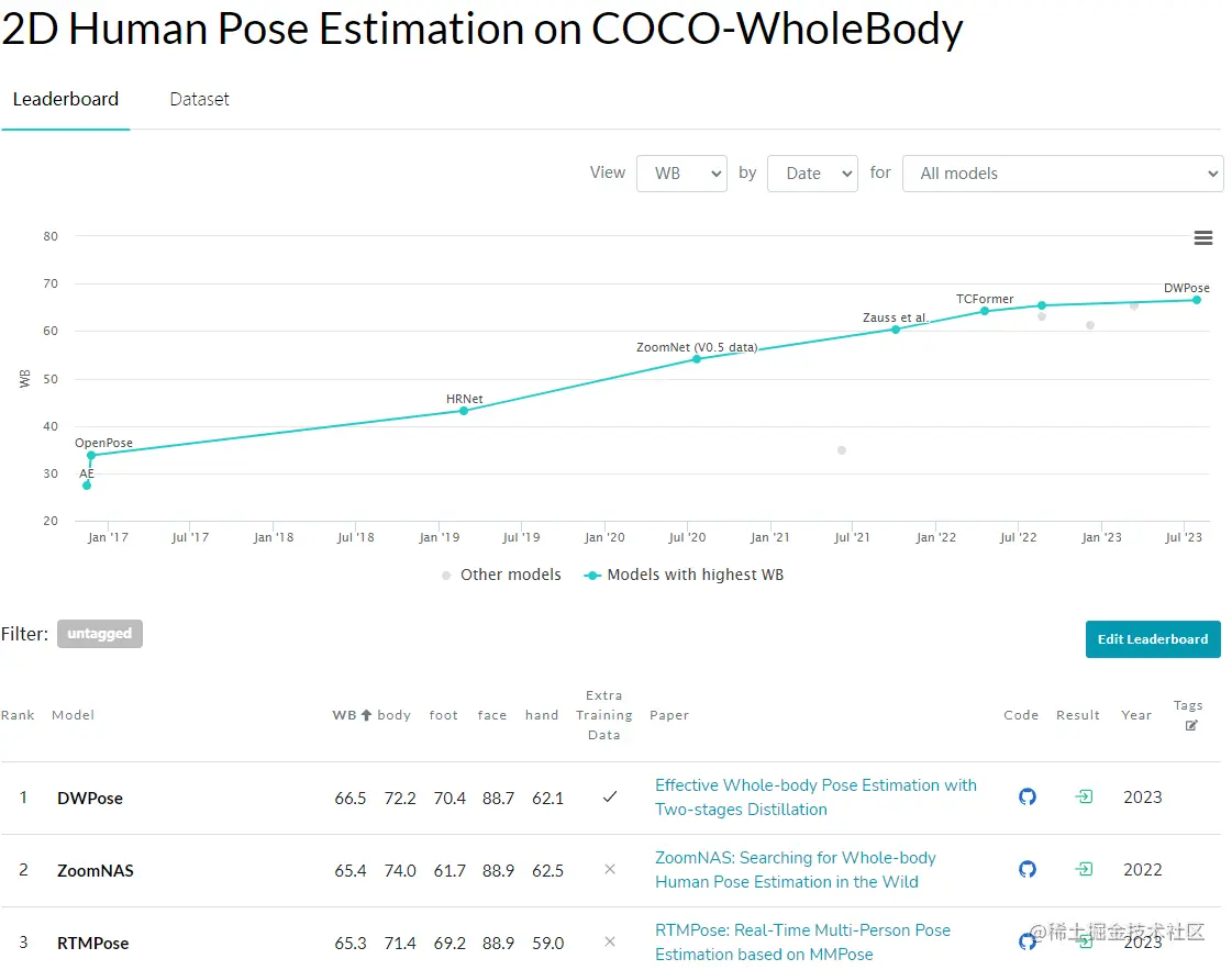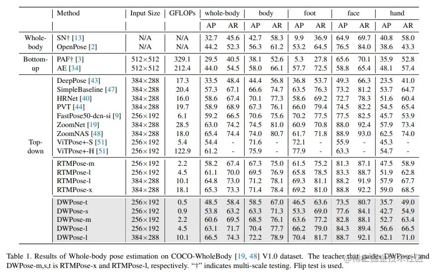 TL;DR: 本文介绍了一种全身姿态估计新方法,以及如何通过知识蒸馏技术来提高这种方法的效率和准确性。截至目前为止,所提方法目前在 paperwithcode 上的2D Human Pose Estimation on COCO-WholeBody榜单登顶榜首,超越 OpenMMLab 社区此前发布的 SOTA 模型 RTMPose.