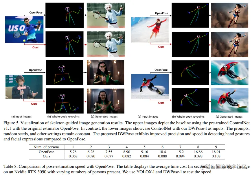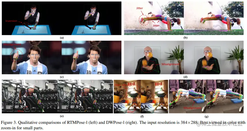 此外,图4中比较了作者提出的方法与常用的OpenPose和MediaPipe中提供的基线方法。可以看出,DWPose 也显著超越了另外两种方法,特别是在截断、遮挡以及细粒度定位的鲁棒性方面。