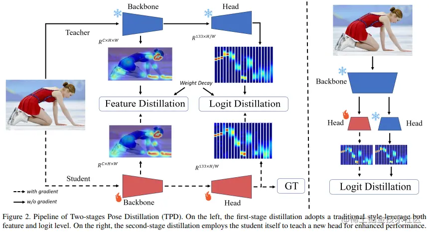 - 第一阶段蒸馏设计了一种权重衰减策略,同时利用教师模型的中间特征和最终的逻辑信息,包括可见和不可见的关键点,来监督从头开始训练的学生模型。