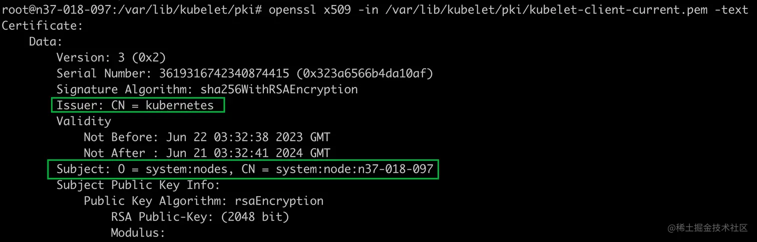 openssl x509 -in /var/lib/kubelet/pki/kubelet-client-current.pem -text