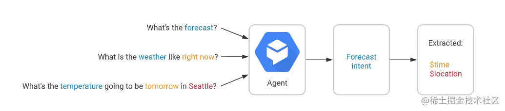 “意图”用于对一轮对话中的最终用户意图进行分类。每个代理可以定义多个意图,组合意图可以处理一段完整的对话。当最终用户输入文字或说出话语(称为“最终用户表述”)时,Dialogflow 会将最终用户表述与代理中的最佳意图进行匹配。匹配意图也又称为“意图分类”。下面是一个天气意图的列子: