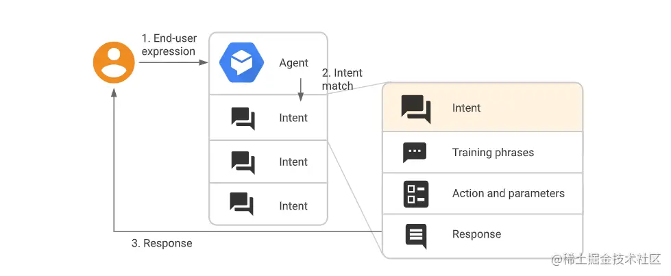 Dialogflow 代理类似于人类呼叫中心的客服人员。您可以对代理/客服人员进行训练来处理预期的对话场景,您的训练不需要过于明确。