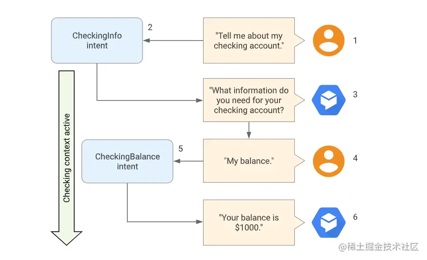 使用上下文来控制对话流。可以为意图配置上下文,方法是设置由字符串名称标识的输入和输出上下文。匹配了某个意图时,为该意图配置的所有输出上下文都将变为活跃状态,下图显示了为银行代理使用上下文的示例。