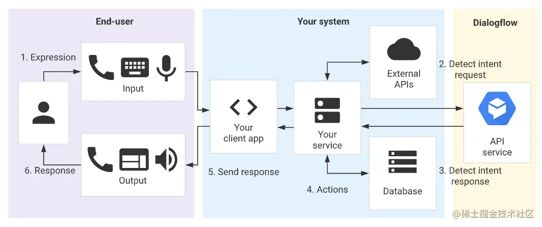 您的服务通过一个检测意图请求消息将此最终用户表达式发送到 Dialogflow。