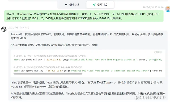 提示语:使用suricata的约定规则生成检测DNS异常流量的规则,要求:1、统计约2s内同一个IP向DNS服务器ip(10.0.0.10)发送DNS解析请求包个数超过1500个。2、2s内有大量的伪造的非内网IP对DNS服务器ip(10.0.0.10)泛洪流量。