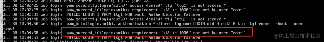 - 尝试登录之后,进入单用户模式,查看 secure 错误日志,从日志中我们可以看出,安全加固限制了只允许 uid 大于 1000 的用户登录,由于root用户的uid是0,所以不满足可以登录的条件