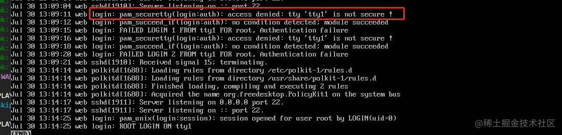 - 再次尝试登录,仍然无法登陆,再次进入单用户模式,查看 secure 错误日志,从日志中我们可以看出,安全加固限制了 tty1 终端登录权限。