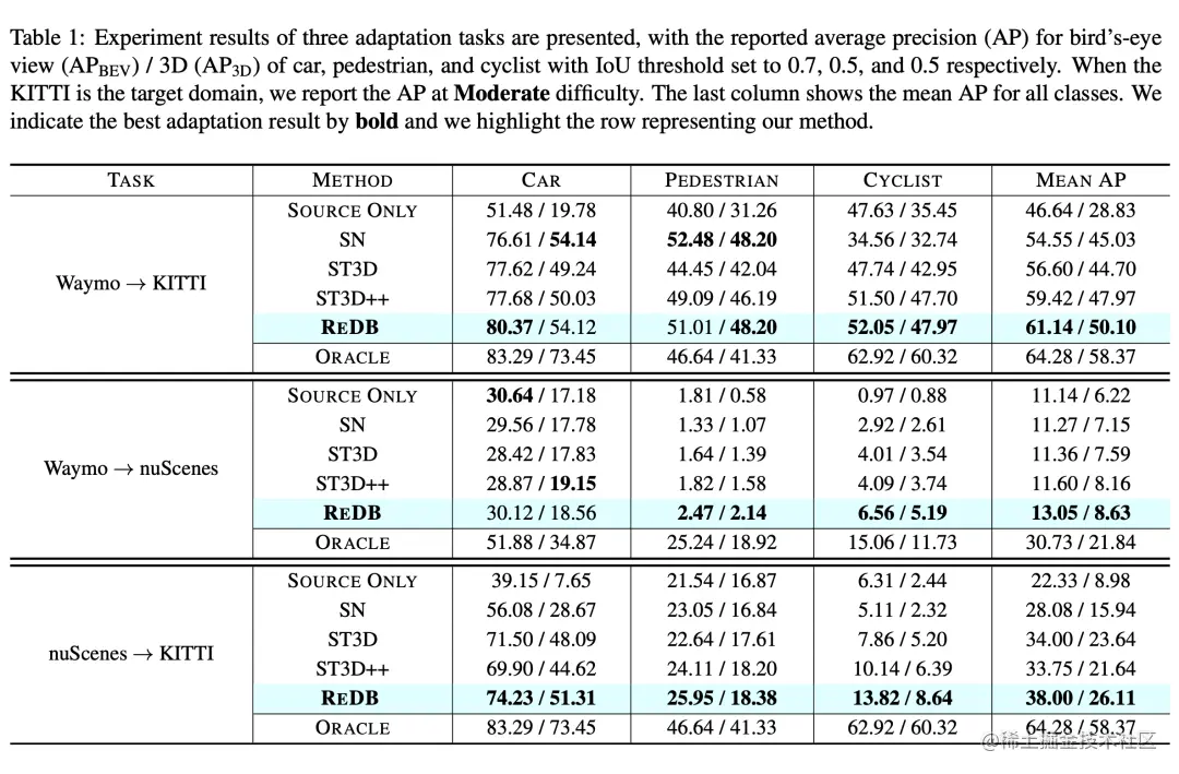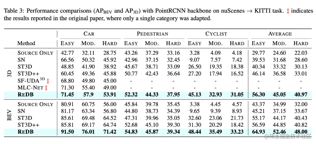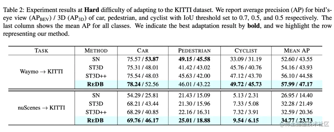 在从 Waymo 自适应到 KITTI 的过程中,所提出的 ReDB 优于 SOTA 方法 ST3D++ 5.81% 的 3D mAP 。在更具挑战性的跨域检测任务中(即 nuScenes → KITTI),光束数量、角度和点云范围都会发生显著的环境变化,ReDB 比 SOTA 方法的 mAP 3D 高出 16.55%。因此,当使用 KITTI 指标的困难难度指标来评估时,我们的方法远远超过了 baseline 方法,这表明 ReDB 能够使 3D 检测器有效地泛化到目标域中困难的物体。