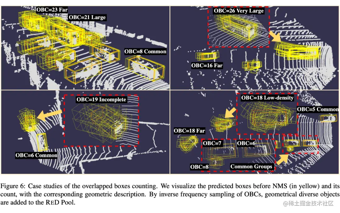 为了避免频繁出现且在尺度上相似的冗余伪标签,必须防止训练的检测器塌陷到一个固定的模式中,这种模式可能只会检测到某些固定模式的物体(如小型汽车),而漏掉其他风格特殊的物体(如公共汽车和卡车)。为了增强几何多样性,我们提出了一个称为“重叠框计数(OBC)”的指标来均匀地下采样伪标签。该度量的设计灵感来自于以下观察:3D检测器倾向于为具有不常见几何形状的物体预测更多的边界框,因为仅使用少量紧密边界框难以定位这些物体。