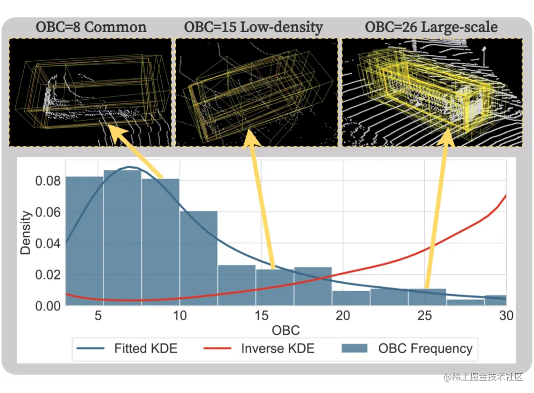 我们将每个检测到的物体周围的回归边界框数目作为 OBC,并使用核密度估计(KDE)来估计其经验分布。然后,我们根据 KDE 的反概率进行下采样,从而有效减少了高密度 OBC 区域的伪标签数量,因为这些区域的物体具有相似且频繁的几何形状。通过从多样化的伪标签子集中学习,3D 检测器可以更好地识别不同尺度和点密度的物体,潜在地消除物体差异。