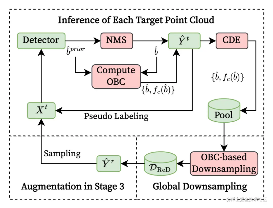 接下来,我们使用 CDE 将合格的 添加到伪标签池中。在推理所有目标域数据之后,我们使用 OBC 对池中的伪标签框进行全局下采样,得到 。在第三阶段,我们在自训练过程中以类平衡的方式从 中采样高质量伪标签(ReDB)物体,从而增强每个目标域点云。第二阶段和第三阶段交替进行,直至收敛。