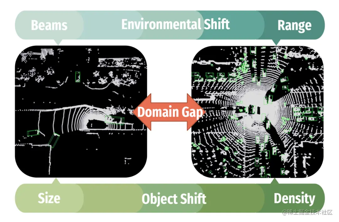 域差异主要来自于物体差异和环境差异,这些因素会显著降低 3D 检测器的预测精度。物体差异指的是训练和测试域之间物体的空间分布、点密度和尺度的变化。例如,Waymo 数据集中汽车的平均长度与 KITTI 数据集中的平均长度相差约 0.91 米。另一方面,环境差异则源自于周围环境的复合差异,如不一致的光束数量、角度、点云范围和数据采集位置。