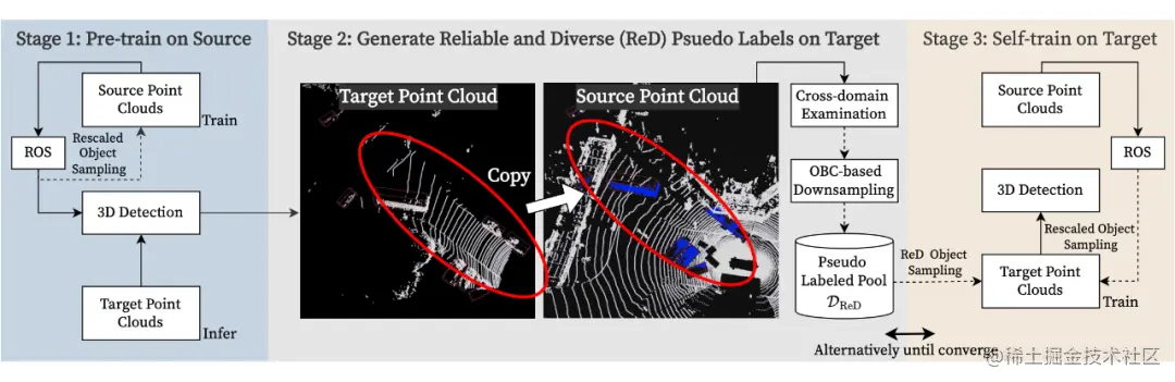 具体而言,所产生的伪标签将经过跨域检查(Cross-Domain Examination,简称 CDE),并由基于重叠框计数(Overlapped Box Counting,简称 OBC)的多样性模块进行下采样,形成可靠且多样化的(RED)的伪标签物体子集。在第三阶段对目标域进行模型自训练时,我们以类平衡的方式在每个点云中随机注入 RED 目标域物体和源域对象,并且源样本的比例逐渐降低。3D 检测器通过在第二阶段和第三阶段之间交替进行,迭代地进行以适应目标域的环境。