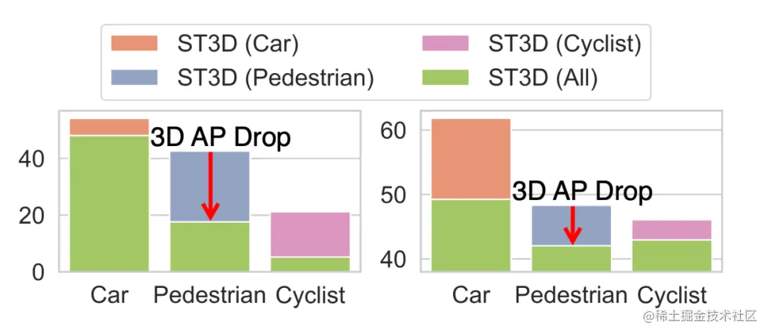 重新审视领域自适应 3D 检测设置。已有的领域自适应 3D 目标检测方法通常遵循单类别训练设置,即对模型进行训练,使其分别适应每一个类别。虽然同时用所有类别来训练一个模型更为实际和公平,但我们的实证研究表明,在切换到多类别设置时,先前方法的检测性能会显著下降(如下图)。这种平均精度(AP)的下降可以归因于生成的伪标签的质量较差(即错误和冗余),以及稀有类别的较低识别准确率(例如在 Waymo 中自行车比汽车少 91 倍)。