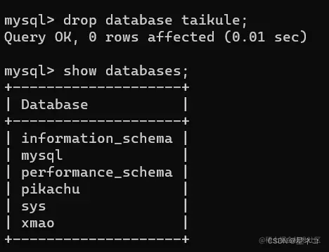 删除数据库,删除刚才建的名为taikule的库名