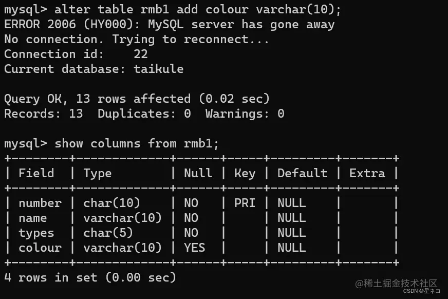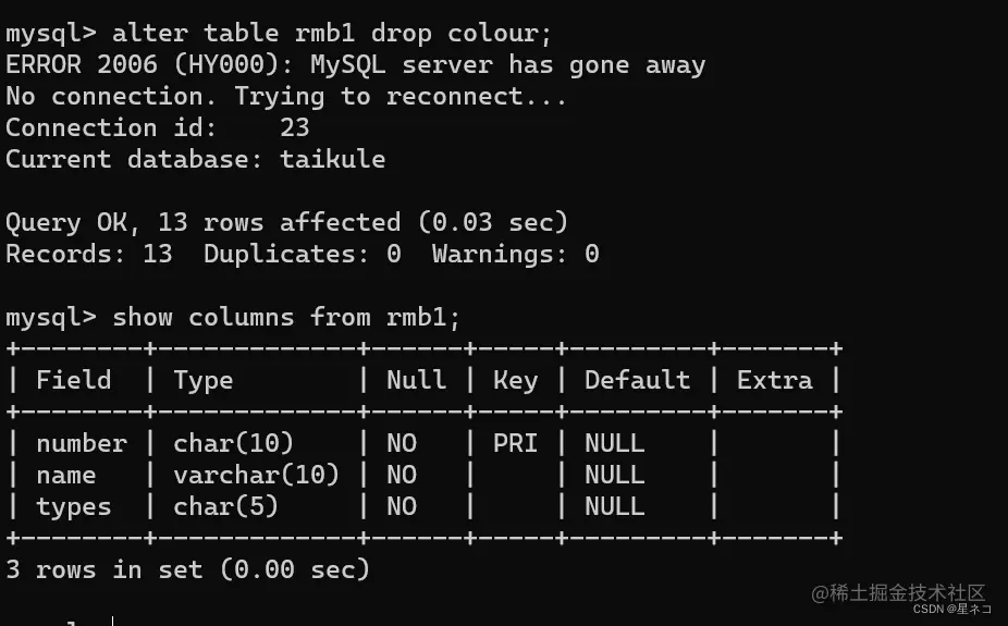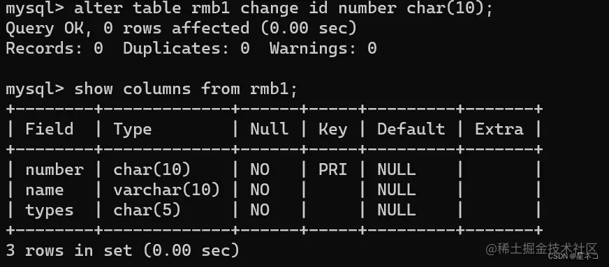 指令 show columns from 表名,查看修改后的字段