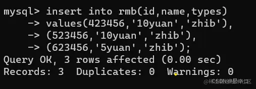 5.值(value)行的具体信息, 每个值必须与该列的数据类型相同;