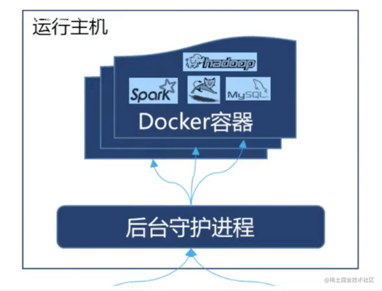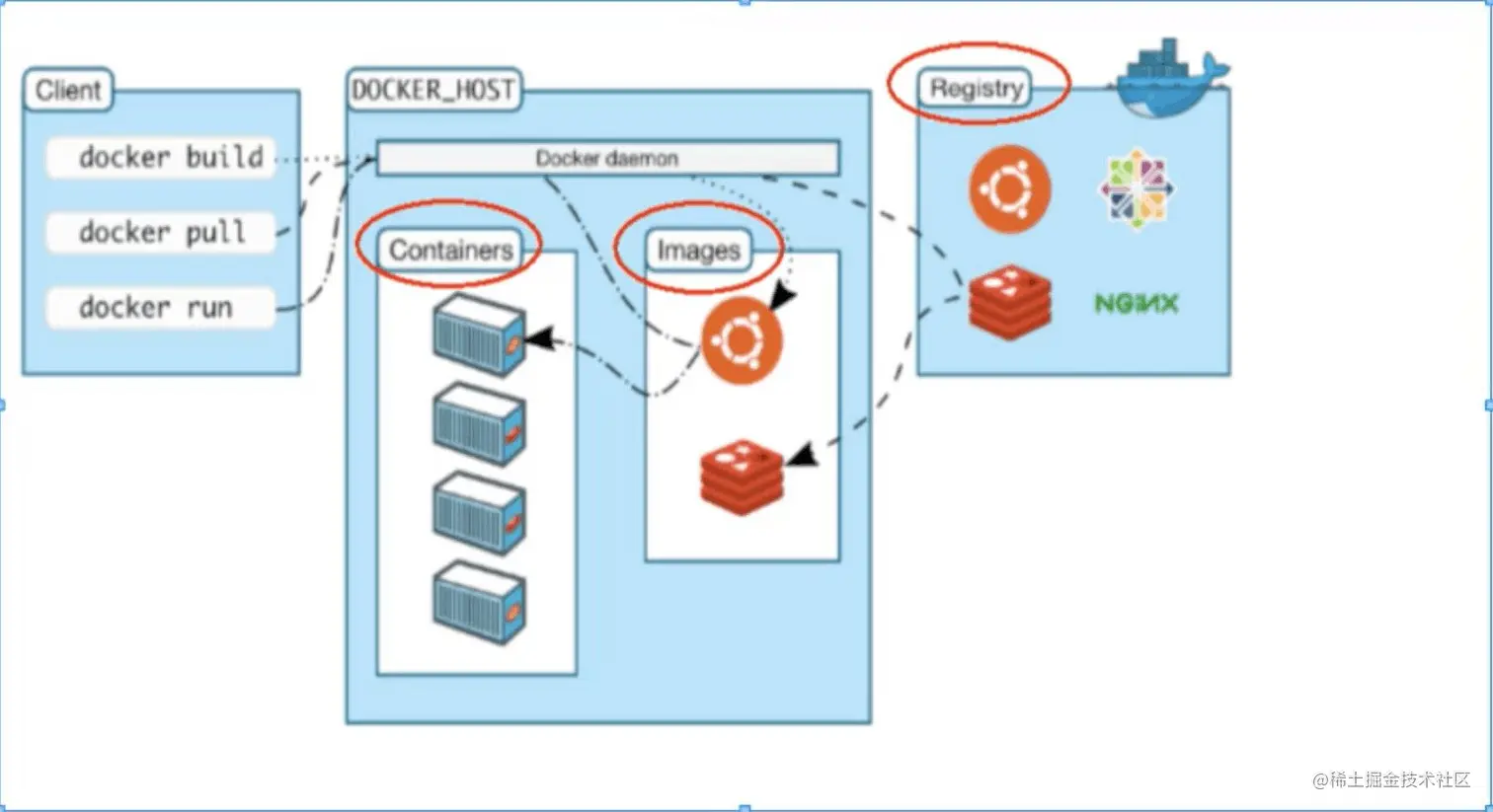 Docker是一个Client-Server结构的系统,Docker守护进程运行在主机上,然后通过Socket连接,从客户端访问,守护进程从客户端接受命令并管理运行在主机上的容器。