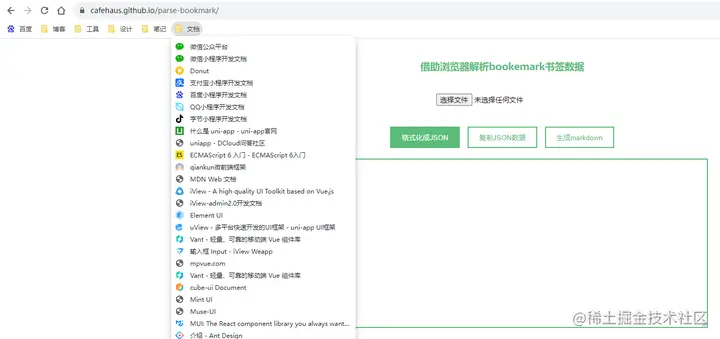 之前为了把浏览器书签放到博客里维护,特意写了一个 bookmark 转 json/markdown 的小工具:parse-bookmark。