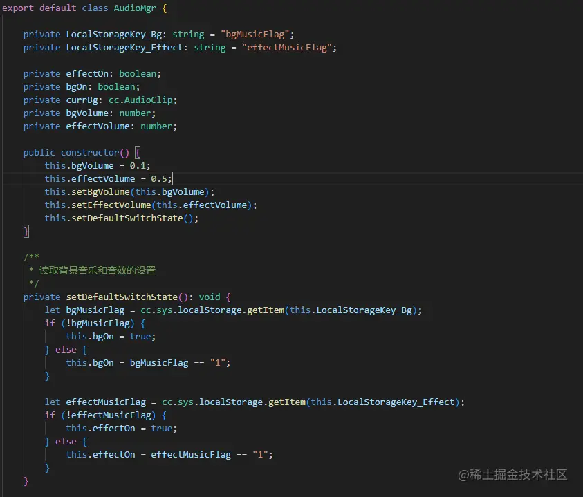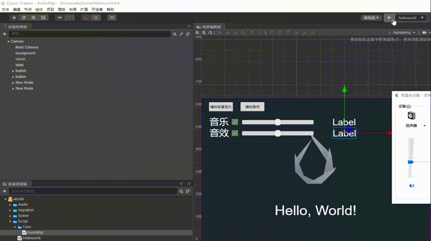 新建脚本AudioMgr,设置默认音量大小,根据本地存储内容设置音乐和音效的开关: