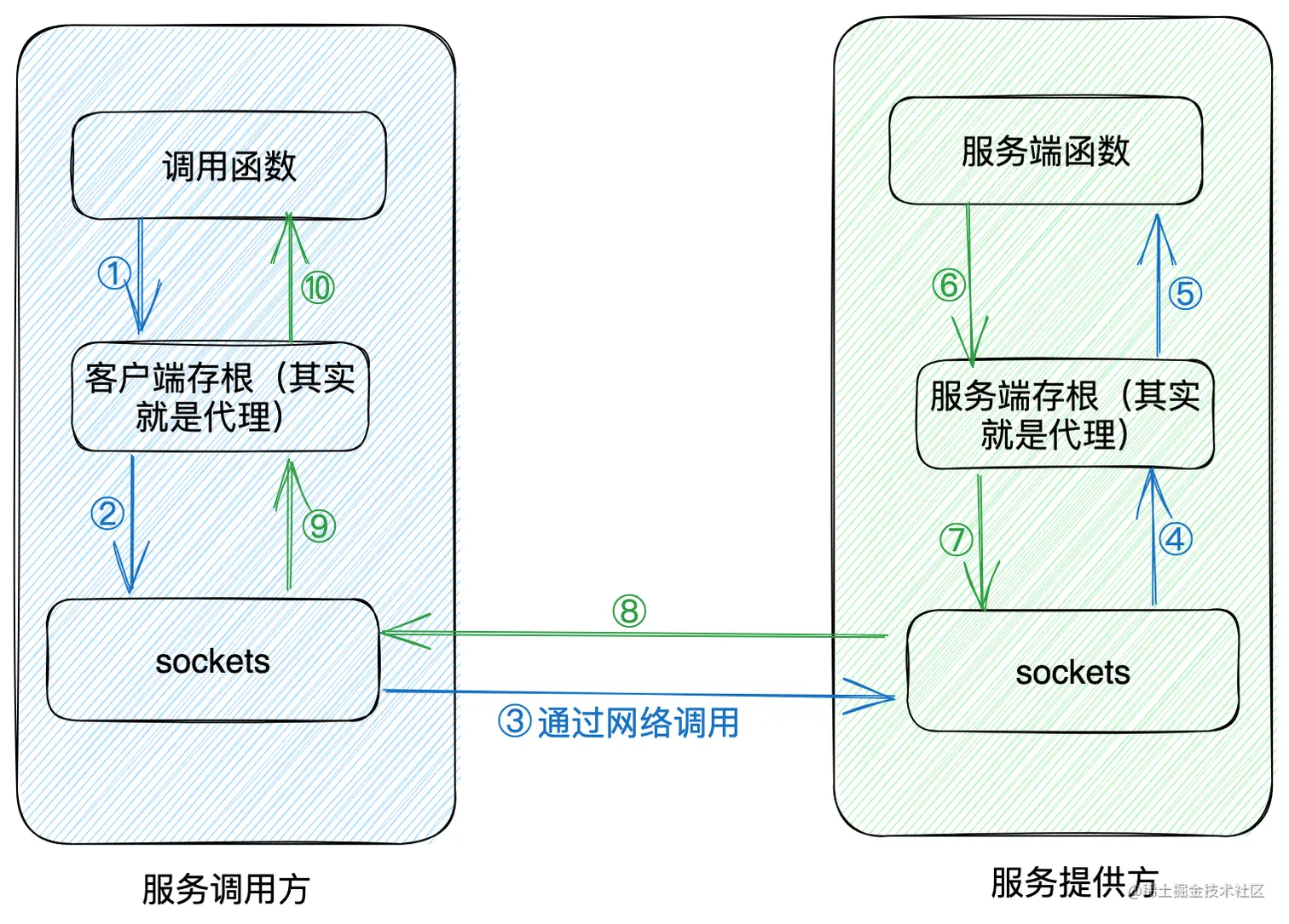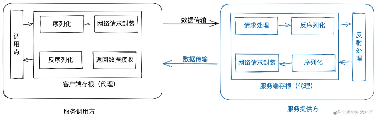 我们看上面的图,其中调用方和服务提供方都有一个部分叫做存根(Stub),就是靠的它。听上去感觉这词不太容易理解啊,啥叫存根呢,其实说简单点儿就是一个代理方案。