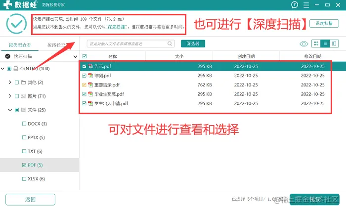 提示:深度扫描结束后,呈现的文件才可能被恢复,若文件没被扫描到,可能由于文件被深度破坏而无法恢复。