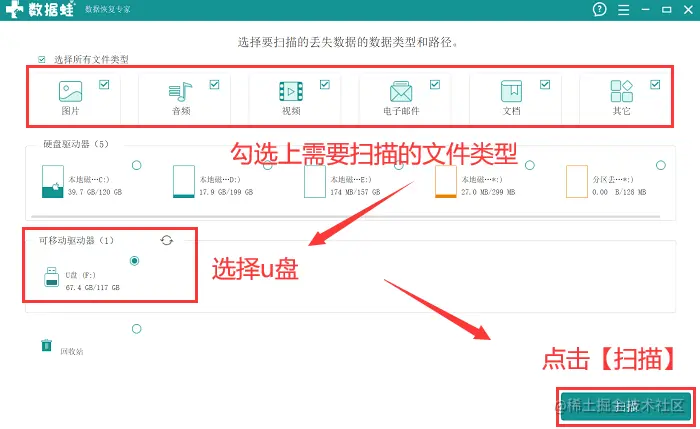 步骤1:将u盘正确连接电脑后进入软件并点击 【免费试用】 ,在主界面中再对需要扫描的相关文件类型进行选择,并在 【可移动驱动器】 下选择u盘,然后执行 【扫描】 ;