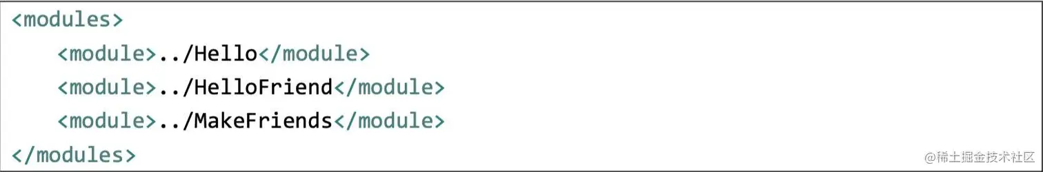 在总的聚合工程中使用 modules/module 标签组合,指定模块工程的相对路径即可: