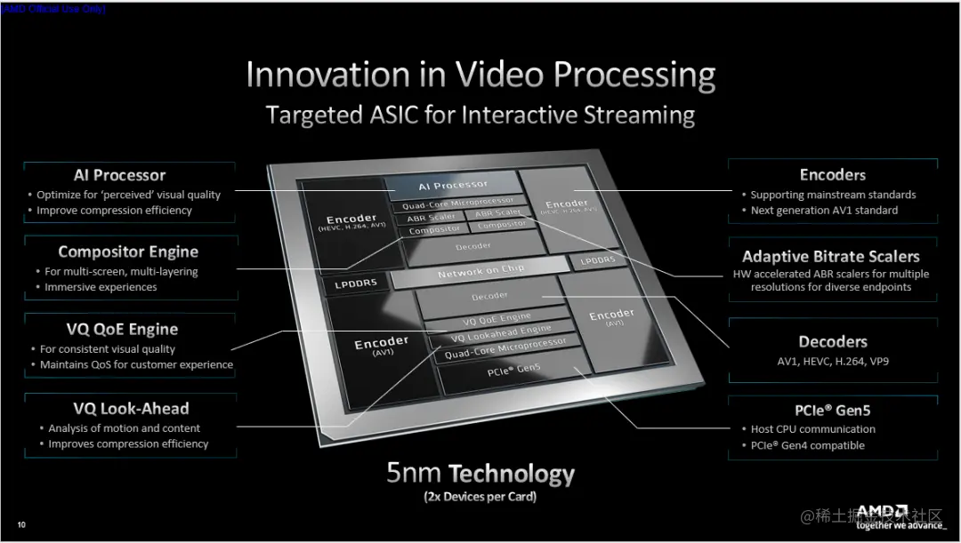 与我们上一代产品(Alveo U30)和传统Xilinx芯片的联系不同,它完全脱离了 FPGA,是一个专门应用于交互式流媒体大规模应用场景的针对性解决方案。它内部包含很多专用视频单元和最先进的IP核,通过PCIE Gen 5.0和LPDDR5保证带宽,充分助力视频加速服务。