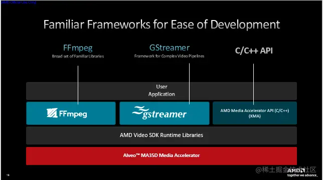 用户可通过我们随卡附带的AMD媒体加速软件开发套件(SDK)访问加速卡,它带有FFmpeg、GStreamer接口,便于快速上手。高阶用户还可以通过AMD 媒体加速器接口客制化调用加速卡的各种视频处理模块。