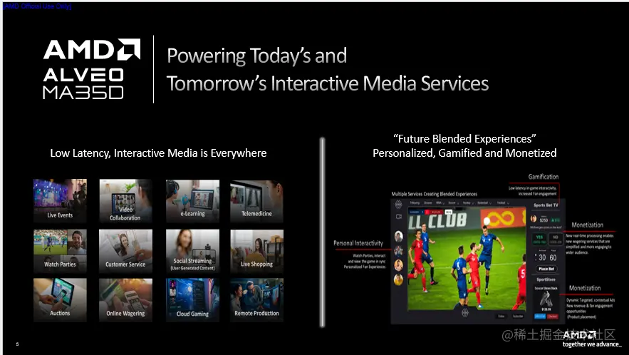 编者按: 实况直播业务随着流媒体市场的发展增长迅速。与传统流媒体“一对多”的模式不同,直播流媒体高交互的特性和 “多对多”的架构对时延的要求越来越高,传统基础设施部署和硬件已经不能高效处理这类需求。在此背景下,AMD专为直播互动流媒体处理打造的新一代Alveo™ MA35D加速卡应运而生。LiveVideoStackCon 2023 上海站邀请了来自AMD AECG的谢旻,为大家分享关于MA35D的基本架构和功能,以及该卡在各个领域视频解决方案中的应用。
