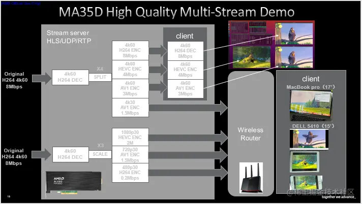接下来介绍MA35D的一次视频处理性能演示,我们使用单卡双芯片同时处理两个4k60 8Mps H264流。其中一路解码后分为四个流以不同码率和编码标准输出,四个流中的三个在同服务器上使用加速卡自带解码器进行转码、编码,传输至显示器。另一路分为三个流按不同分辨率、码率和编码标准输出,同第一路中的第四个流一并无线传输至不同设备解码显示。