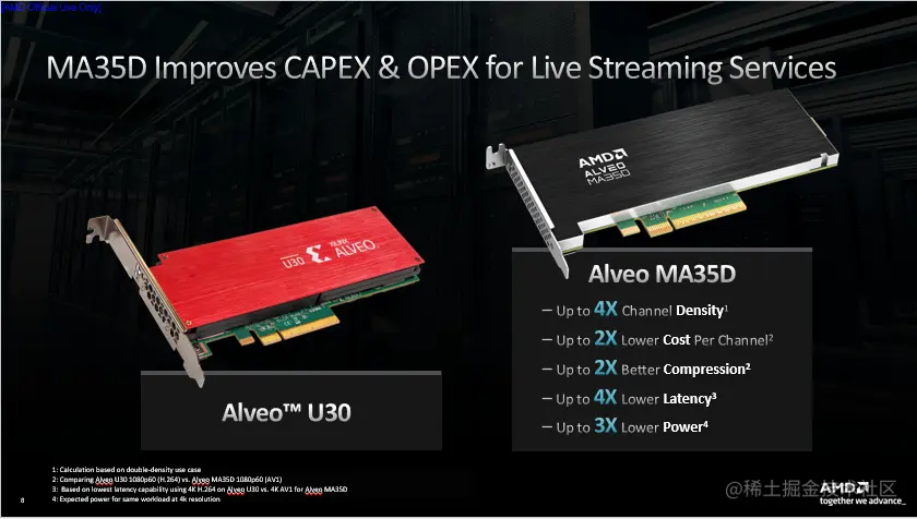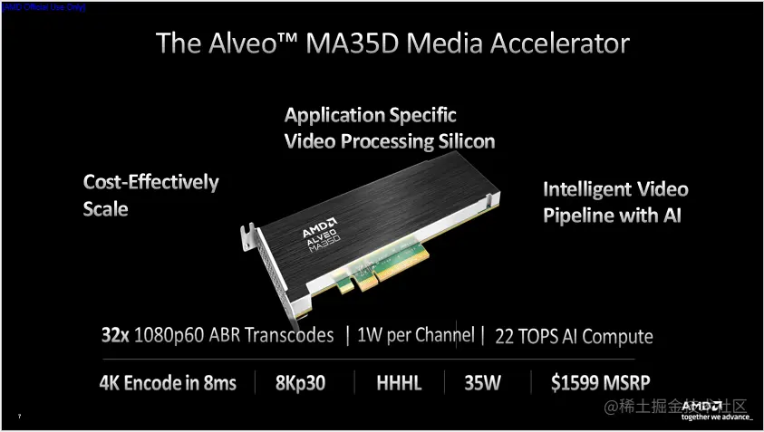 我们将此次推出的新一代加速卡命名为Alveo MA35D Media Accelerator,它是业界首款基于ASIC的5nm视频加速卡,在我们内部的芯片代号为supernova。