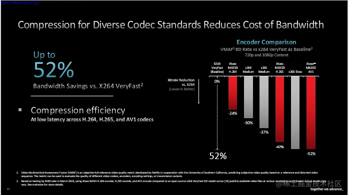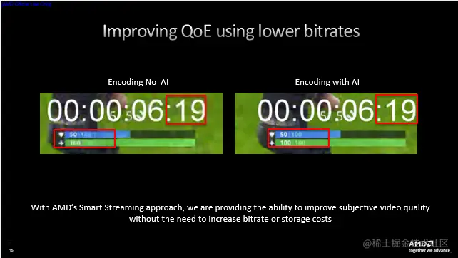 我们也致力于改善编解码器的压缩效率。据AMD内部测试结果显示,在达到同等视觉质量的前提下,以X264 VeryFast为基准对比,AMD H.264编码器可实现24%的码率节省,H.265编码器可节省47%,AV1编码器可节省高达52%。如果加入AI处理环节,压缩效率还将进一步提升。