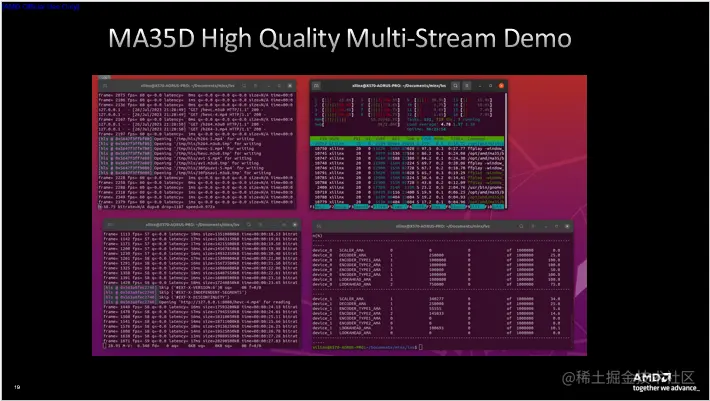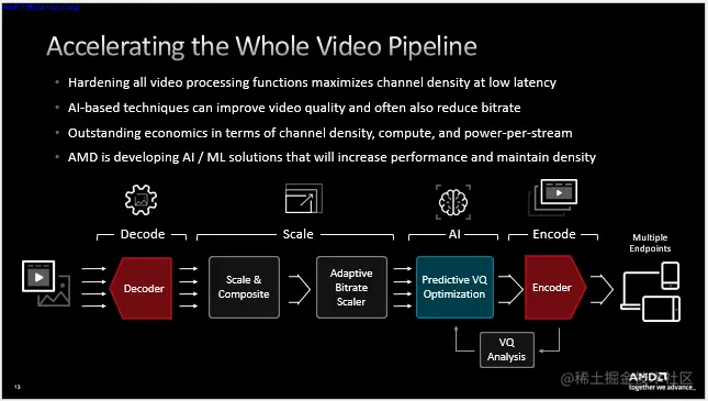 AMD深度耦合前述的各类硬件单元形成了上图所示的视频处理管道,视频解码、缩放与合成、ABR缩放、AI处理、编码、质量分析等步骤全部由硬件单元完成,通过将所有视频处理功能硬化来最大限度减少CPU和加速卡之间的数据迁移。