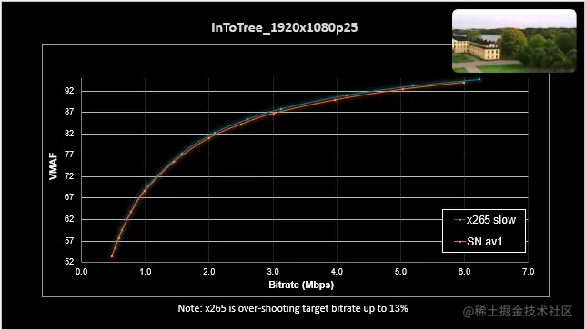 上图展示了X265和AMD AV1编码相同视频的实测VMAF测试结果。可以看到在同等条件下,AMD AV1编码视频的质量接近于X265 Slow,尤其在码率较低时表现相当好。