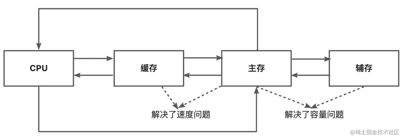 - 由于CPU和主存的处理速度不一样,所以增加了缓存,缓存的容量比主存小但是运行速度快,主存把数据复制到缓存,CPU直接读取缓存中的数据。(该方式是通过硬件把缓存和主存结合在一起,加快处理速度,实际处理数据的时候使用的是主存的实地址)