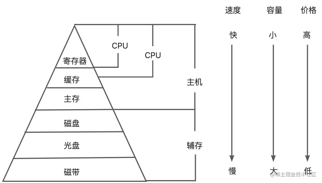 - 从金字塔从上往下,存储器的速度越来越慢、容量越来越大、价格越来约低