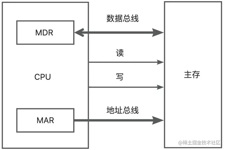 - CPU和主存中的MDR通过数据总线相互连接,用于数据的输入和输出