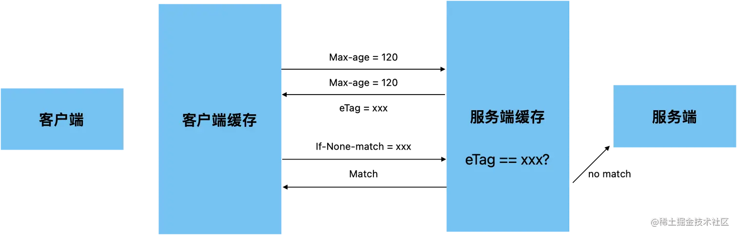 - 再两分钟后,缓存失效,请求服务端,此时比较文件和eTag == If-None-match是否一致,一直使用缓存,不一致走服务端
