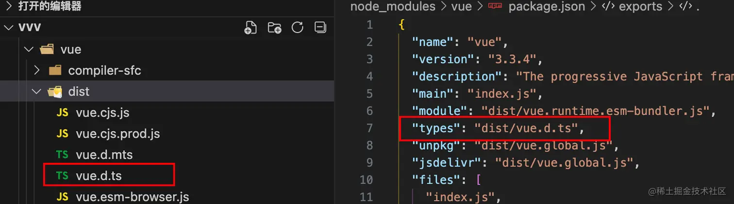 然后在packages.json里配置types属性,这样就不需要发布单独的@types包了。比如vue