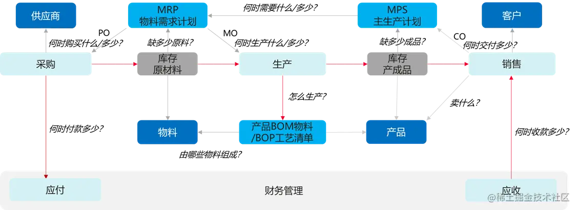 生产制造环节的业务活动主线,从产品的视角描述,简单点说就是将从供应商采购的原材料按产品研发设计的规格要求和工艺配方,生产加工为产成品,最后卖给客户;从订单的视角描述,简单点说按客户订购产品的交期和数量的需求,制定生产计划和实施加工任务,以及倒排运算物料需求计划、拉动原材料采购来按时保质保量地达成产品生产计划,最后按销售订单如期发货。
